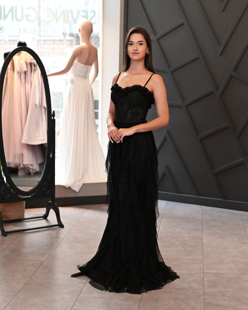 Askılı Dantelli Lazer Kesim Tül Etek Uzun Abiye Elbise